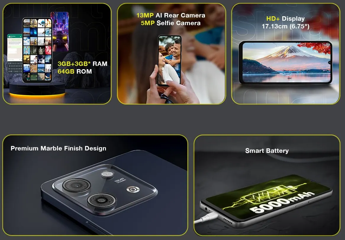 カラーはCrystal GoldとCrystal Blueの2色。インドで2025年10月に発売済、価格はRAM3GB/64GB 5999INR(約1.0万円)となっています。