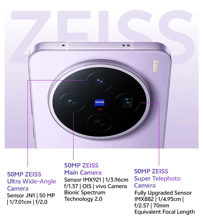 ZEISS監修の50MPトリプルカメラ、リフレッシュレート120Hzの高解像度ディスプレイ、90W急速充電対応の6200mAhバッテリーなどが特長のモデルです。OSはAndroid 16 (OriginOS 6)、防水防塵対応、指紋認証は画面内、イヤホンジャックはなし、接続端子はUSB Type-Cです。