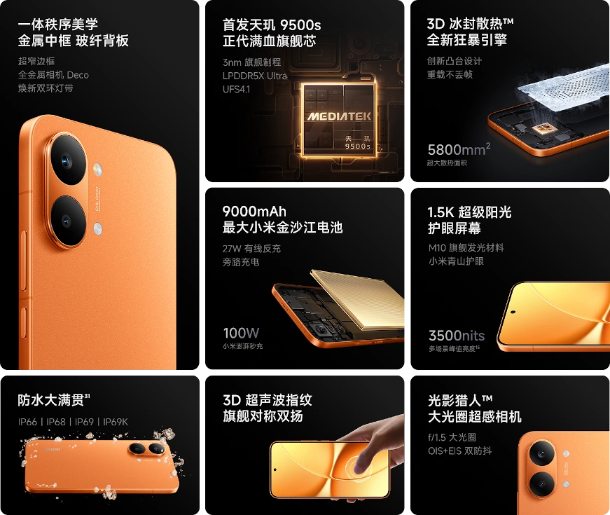 AnTuTuベンチ 約361万の新SoC MediaTek Dimensity 9500s採用や100W急速充電対応9000mAh大容量バッテリー、光学手振補正付き50MPカメラなどが特徴です。高解像度な有機ELディスプレイ、防水防塵対応、OSはAndroid 16(Xiaomi HyperOS 3)、ハイレゾ、ステレオスピーカー、接続端子はUSB Type-C、イヤホン端子はなし、生体認証は指紋認証と顔認証に対応しています。