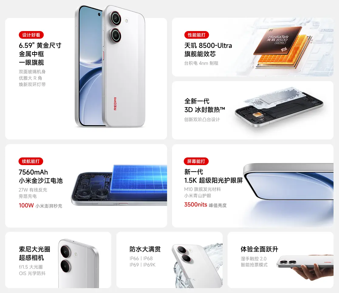 Xiaomi REDMI Turbo 5は、MediaTek Dimensity 8500-Ultraを搭載したミッドハイ向けAndroidスマートフォンで、6.59インチ有機ELディスプレイや100W急速充電対応7560mAh大容量バッテリー、OIS対応50MPカメラを備えるモデルです。中国で発売、価格は1999元(約4.5万円)から。