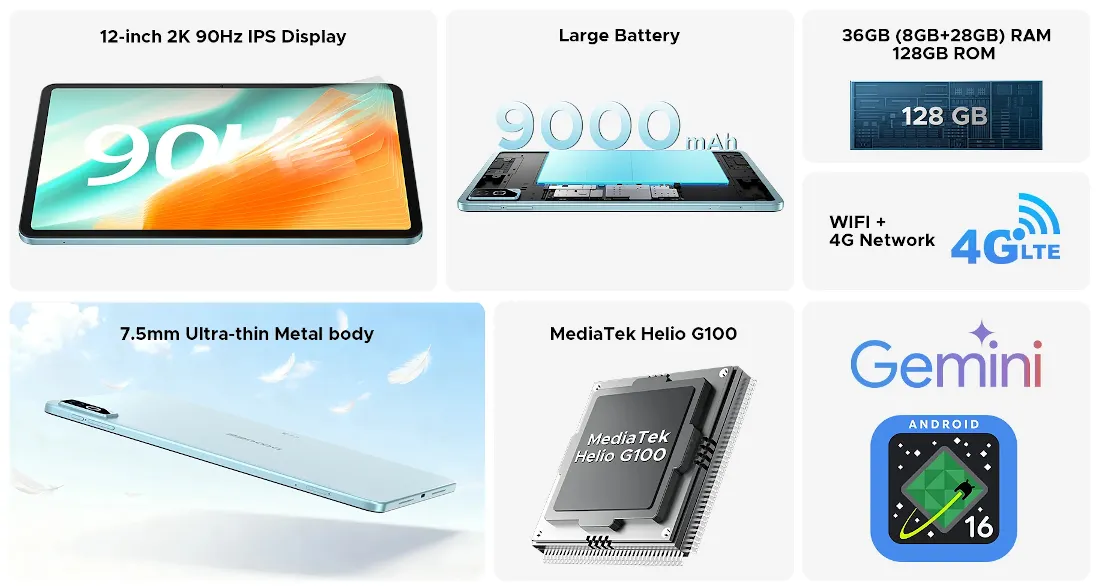 DOOGEE Tab G6 Pro は、12インチ(1920×1200)、CPUにMediaTek Helio G100 2.2GHz オクタコア、RAM8GB、ストレージ容量は128GB、メインカメラは1300万画素カメラ搭載のミッドロークラスのアンドロイドタブレットとなっています。