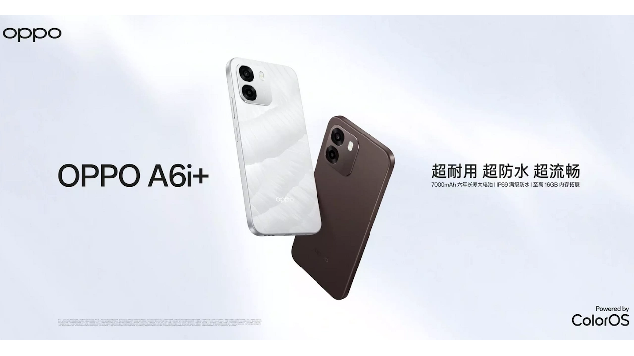 OPPO A6i+ (PLT120) は、MediaTek Dimensity 6300、6.75インチHD+・120Hzディスプレイ、5000万画素デュアルカメラ、7000mAhバッテリーを搭載した5Gスマートフォンです。中国で2026年2月に発売、価格は1499CNY(約3.4万円)から。