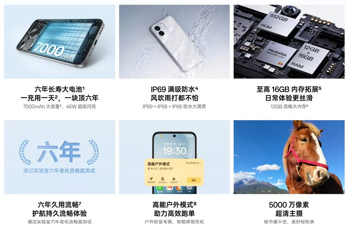 大容量7000mAhバッテリーやリフレッシュレート120Hzディスプレイ、防水防塵対応などが特徴です。5G通信対応、OSはAndroid 15 (ColorOS 15.0)、生体認証は指紋認証センサー(サイド)と顔認証に対応、イヤホン端子はあり、接続端子はUSB Type-Cです。