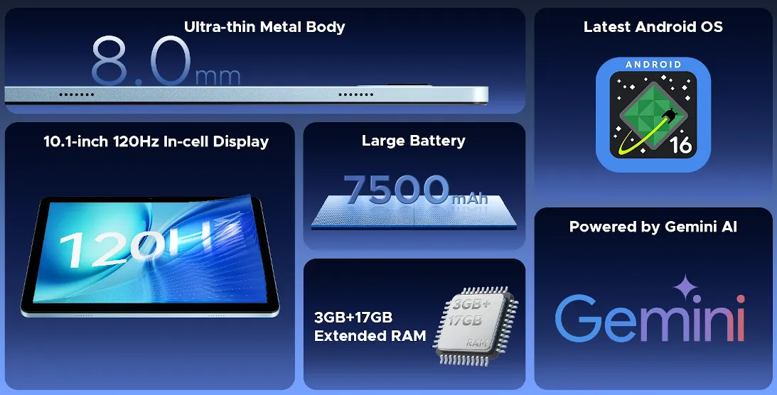 DOOGEE Tab G5は、UNISOC T7200搭載の10.1インチエントリーAndroidタブレットで、120Hzディスプレイや4G LTE対応、7500mAhバッテリー、デュアルSIMを備え、動画視聴や普段使いに適した低価格モデルです。
