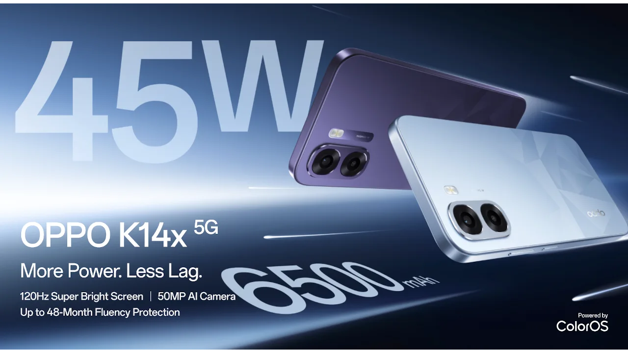 OPPO K14x 5G (CPH2871)は、Dimensity 6300を搭載した5Gスマートフォンで、6.75インチ120Hzディスプレイや6500mAh大容量バッテリー、45W急速充電、防水防塵に対応したモデルです。インドで発売、価格は14,999INR(約2.6万円)から。