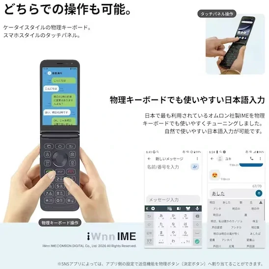 メインディスプレイはタッチ操作可能、文字入力はオムロンのIME「iWnn」、通知など表示されるカラーサブディスプレイ、「安心メッセージ」機能を搭載、防水防塵対応、4G LTE対応、イヤホン端子はあり、接続端子はUSB Type-Cです