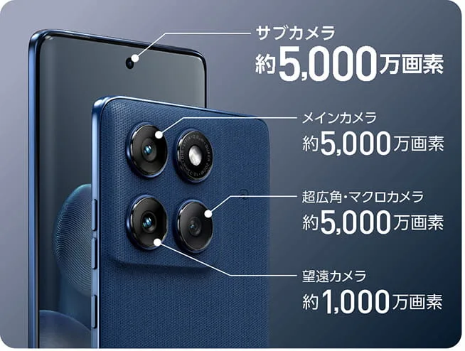 光学手振れ補正付トリプルカメラ、リフレッシュレート120Hzディスプレイ、moto AI、68W急速充電対応5200mAhバッテリー、軽量179グラム、防水防塵耐衝撃(IP68/MIL-STD-810H)対応などが特徴のモデルです。OSはAndroid 16、指紋認証センサー、イヤホンジャックなし、接続端子はUSB Type-Cです。