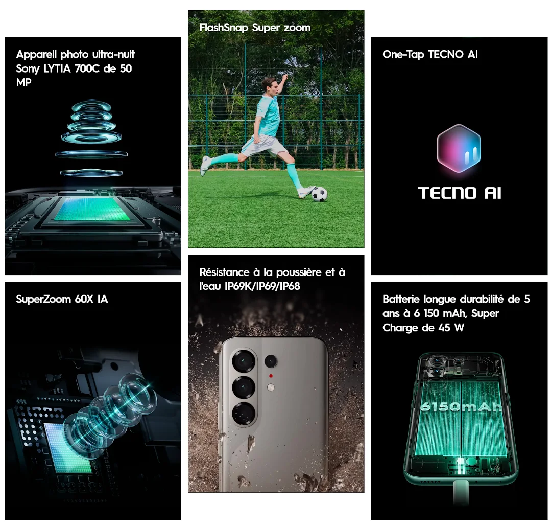 Sony LYT-700Cセンサー採用の光学手振補正付き50MPメインと光学3倍ズームの3眼カメラや45W充電対応6150mAh大容量バッテリー、防水防塵対応、リフレッシュレート144Hzの有機EL曲面ディスプレイなどが特徴です。OSはAndroid 16(HiOS)。接続端子はUSB Type-C、生体認証は指紋認証と顔認証に対応しています。