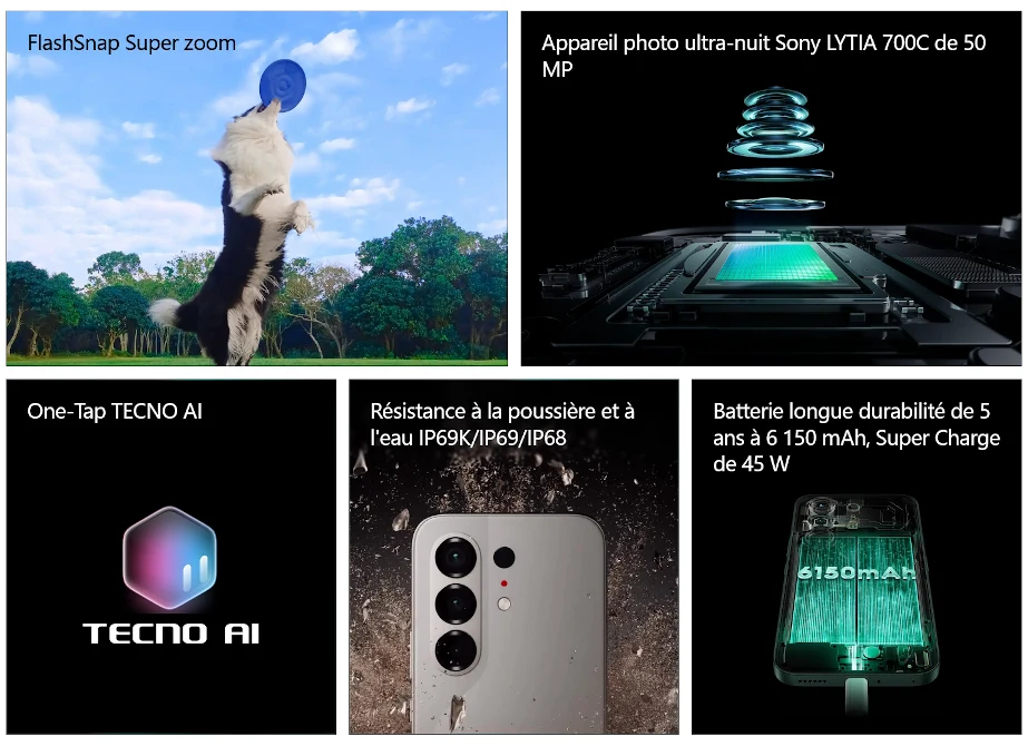 Sony LYT-700Cセンサー採用の光学手振補正付きカメラや45W充電対応6150mAh大容量バッテリー、防水防塵対応、リフレッシュレート144Hzのディスプレイなどが特徴です。OSはAndroid 16(HiOS)。接続端子はUSB Type-C、生体認証は指紋認証と顔認証に対応しています。