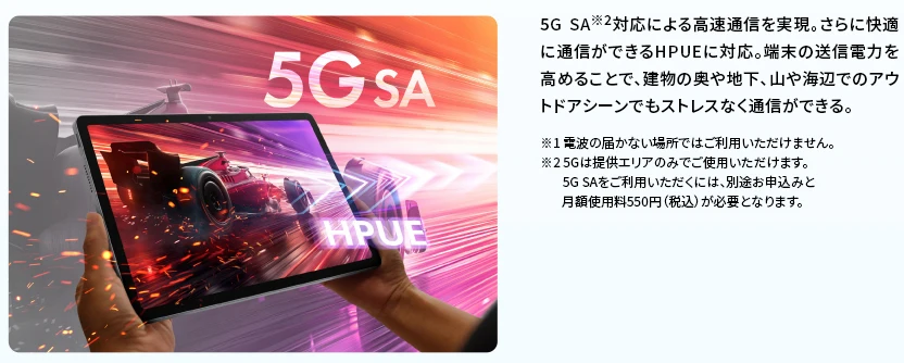 5G SA通信とさらに快適な通信が出来るHPUEに対応、高解像度ディスプレイ、クアッドスピーカーなどが特徴のモデルです。防水防塵対応、バッテリー容量は7040mAh、OSはAndroid 15、イヤホンジャックはあり、接続端子はUSB Type-Cです。国内で販売中のWiFiモデルLenovo Idea TabやLAVIE Tab T11Nとほぼ同じスペックです。