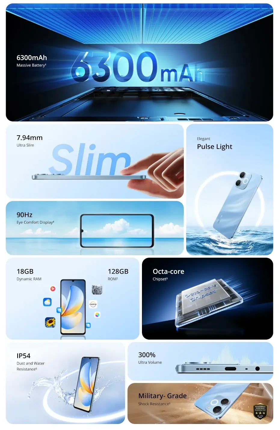 カラーはSea Blue , Obsidian Black , Beach Goldの3色。インドで2026年2月に発売、価格はRAM4GB/64GBモデルが9,999INR(約1.7万円)、RAM4GB/128GBモデルが11,999INR(約2.1万円)となっています。