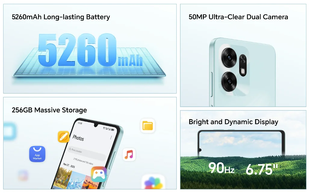 HONOR X6d 5G は、6.75インチHD+(1600×720)ディスプレイ、CPUはMediaTek Dimensity 6300 2.4GHz オクタコア、RAM4GB/6GB、ストレージ容量は128GB/256GB、カメラは5000万画素デュアルカメラのエントリークラスのアンドロイドスマートフォンとなっています。