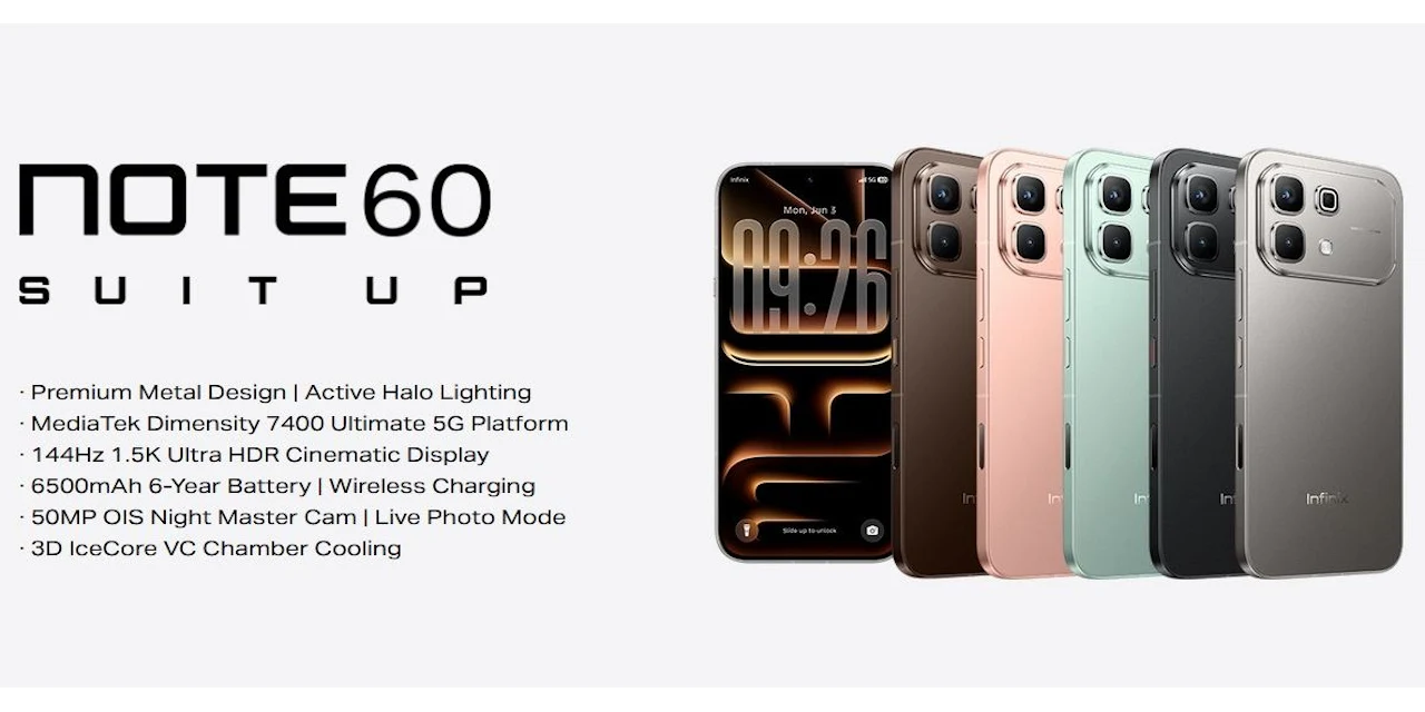 Infinix NOTE 60 は、MediaTek Dimensity 7400 Ultimate搭載のミッドレンジ5Gスマートフォンで、144Hz対応6.78インチ有機ELやOIS付50MPカメラ、6500mAhバッテリーを備えたモデルです。海外でに発売、インドネシアでの価格は4,099,000IDR(約3.8万円)。
