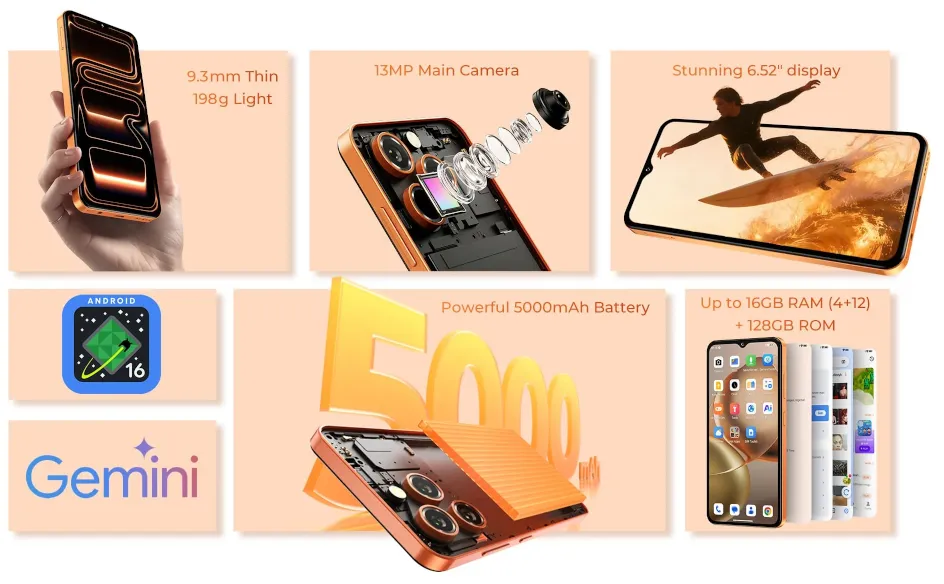 5000mAhバッテリーやiPhone風デザインなどが特徴のモデルです。OSはAndroid 16、イヤホン端子はあり、接続端子はUSB Type-Cです。