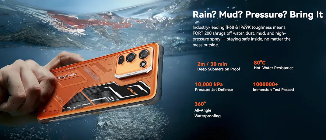 Blackview FORT 200は、Helio G100を搭載したタフネススマートフォンで、6.78インチ120Hzディスプレイや108MPカメラ、防水防塵・耐衝撃(IP68/IP69K/MIL-STD-810H)に対応するモデル。海外で発売予定。