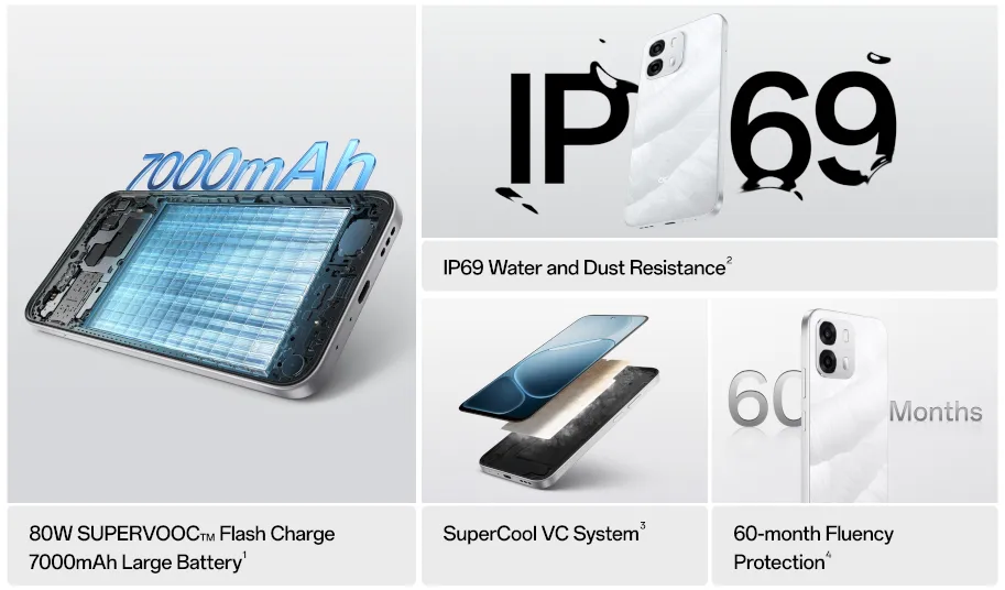 80W充電対応の7000mAhバッテリーやリフレッシュレート120Hzディスプレイ、防水防塵対応などが特徴です。5G通信対応、OSはAndroid 15 (ColorOS 15.0)、生体認証は指紋認証センサー(サイド)と顔認証に対応、イヤホン端子はなし、接続端子はUSB Type-Cです。