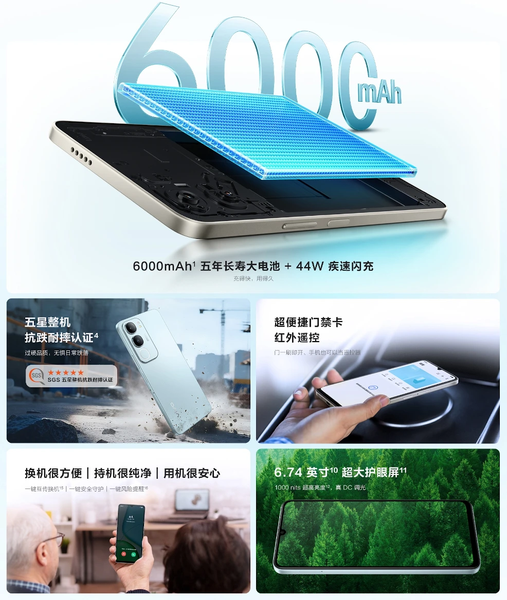 6000mAh大容量バッテリー搭載や防水防塵耐衝撃(IP64)などが特徴です。OSはAndroid 15 (OriginOS 5)、接続端子はUSB Type-C、イヤホン端子はあり、生体認証は指紋認証センサー(サイド)と顔認証に対応しています。
