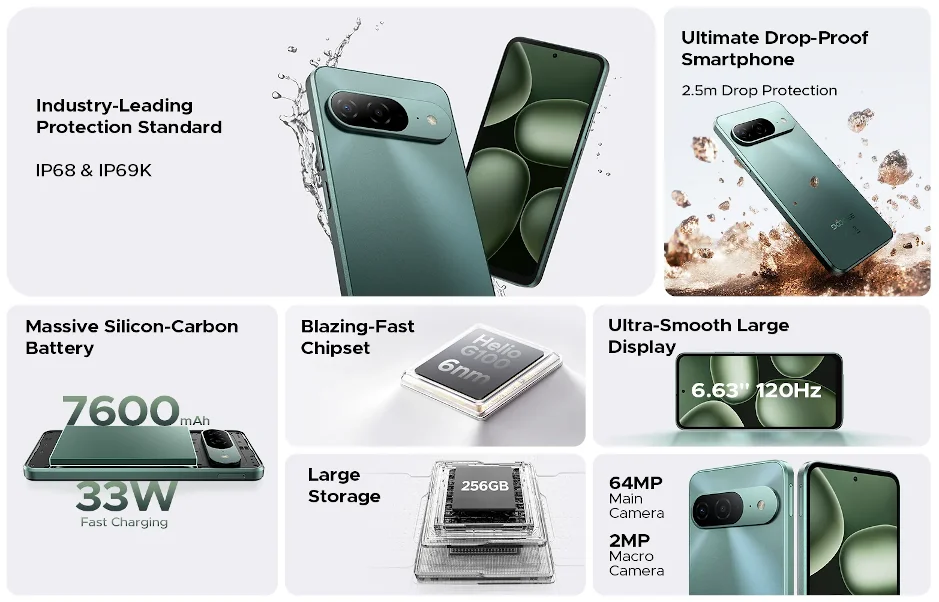 DOOGEE B10 は、6.63インチFHD+(2400×1080)ディスプレイ、CPUはMediaTek Helio G100 2.2GHz オクタコア、RAM6GB、ストレージは256GB、メインカメラは6400万画素+200万画素デュアルカメラ搭載のミッドレンジクラスのAndroidスマートフォンです。