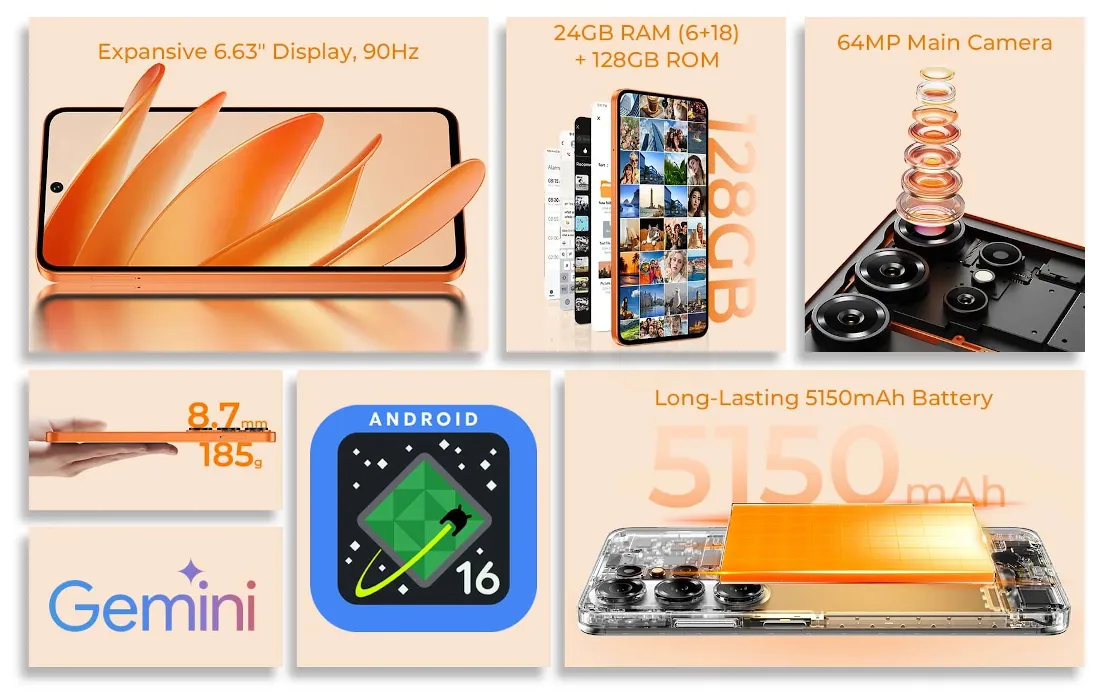 OUKITEL C26 は、6.63インチ(1280×576)のディスプレイ、CPUにUNISOC T615 1.6GHz オクタコア(T7250)、RAM4GB/6GB、ストレージ容量は128GB、メインカメラは6400万画素カメラ搭載のエントリークラスのアンドロイドスマートフォンとなっています。