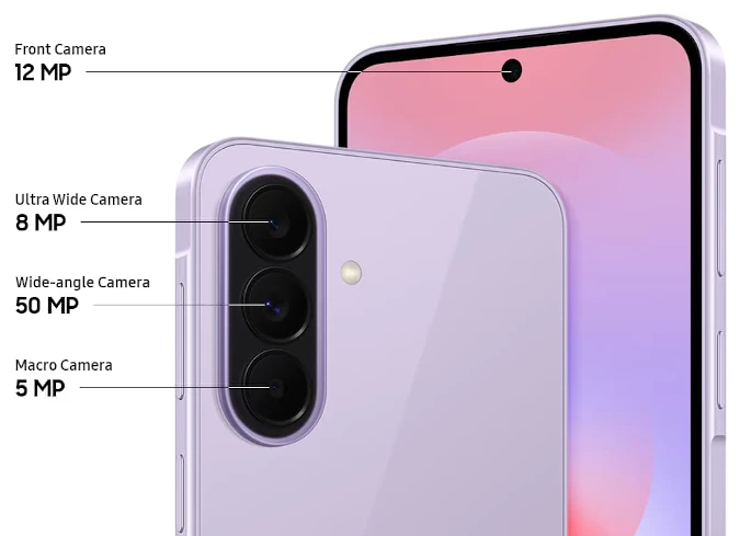 Galaxy A37 5G は、6.7インチFHD+(2340×1080)ディスプレイ、CPUはSamsung Exynos 1480 2.75GHz オクタコア、RAM6GB/8GB/12GB、ストレージ容量は128GB/256GB、メインカメラは5000万画素+800万画素+500万画素トリプルカメラ搭載のミッドロークラスのAndroidスマートフォンです。