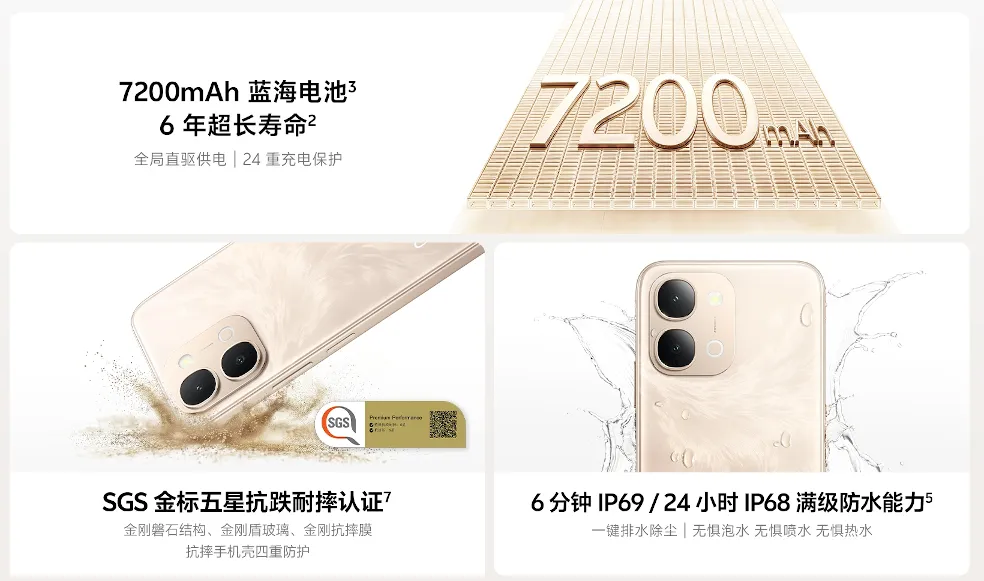 44W急速充電対応7200mAhバッテリー搭載や防水防塵(IP68/IP69)・耐衝撃対応、5G通信対応などが特徴です。OSはAndroid 16 (OriginOS 6)、接続端子はUSB Type-C、生体認証は指紋認証センサー(サイド)と顔認証に対応しています。