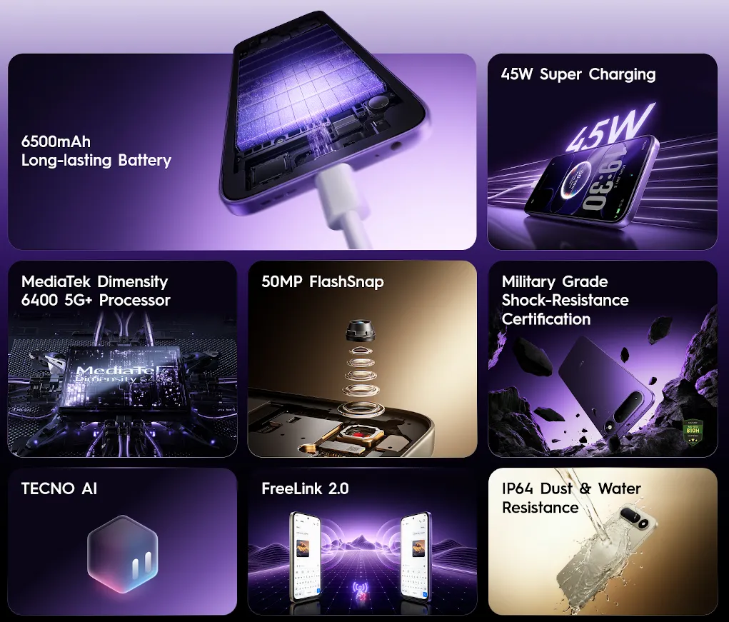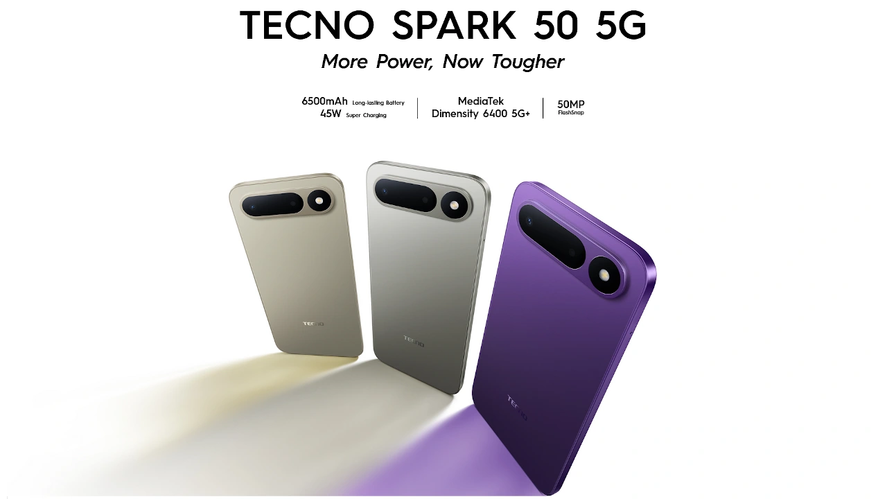 TECNO SPARK 50 5Gは、120Hz対応ディスプレイや6500mAh大容量バッテリーを搭載した5Gスマートフォン。45W急速充電に対応。海外で発売、価格は16,999INR(約2.9万円)から。