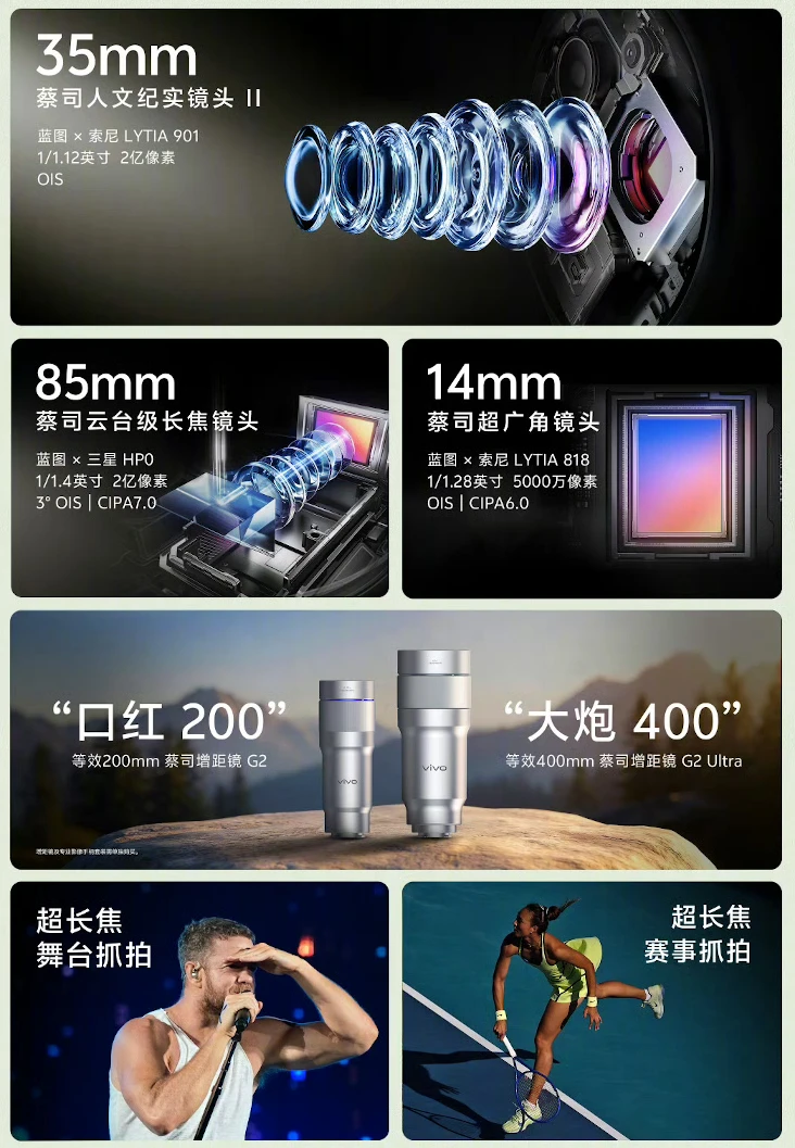 ZEISSレンズでソニー LYTIA 901 1/1.12インチセンサーの2億画素メイン 35mmとサムスン HP0 1/1.14インチセンサーの2億画素85mm望遠・光学手振補正付広角レンズのトリプルカメラ、オプションのZEISS G2/G2 Ultra 外付けテレコン200mm/400mm望遠レンズ、リフレッシュレート144Hzの高画素ディスプレイ、100W急速充電と40Wワイヤレス充電対応の6600mAhバッテリーなどが特長のモデルです。