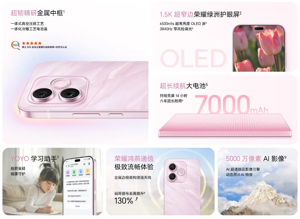 新SoC MediaTek Dimensity 6500 Elite採用やリフレッシュレート120Hz有機ELディスプレイ、7000mAh大容量バッテリーなどが特徴のモデルです。OSはAndroid 16 (MagicOS 10)、イヤホン端子はなし、接続端子はUSB Type-Cです。
