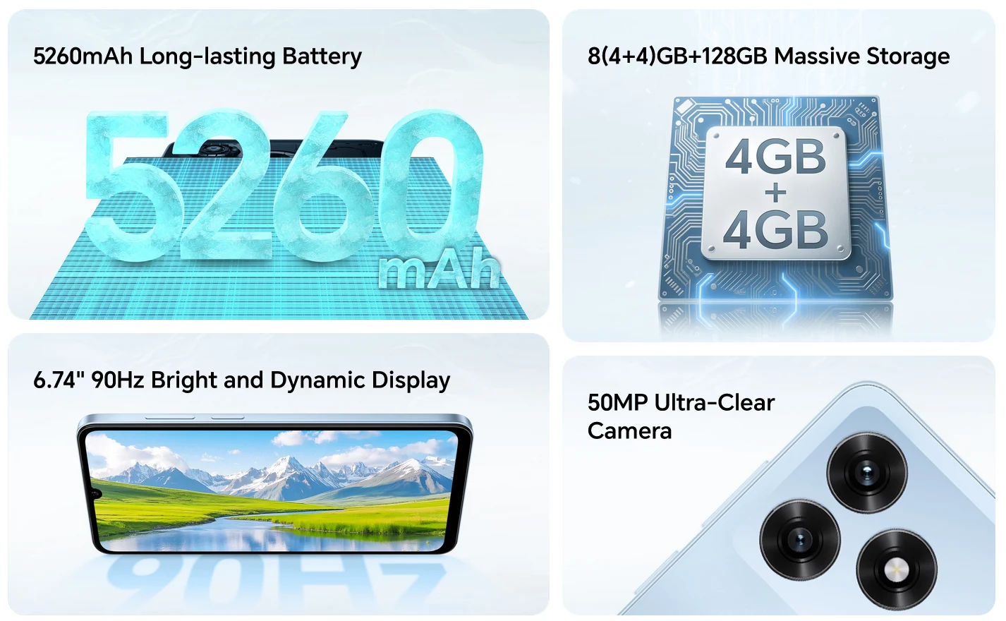 HONOR X5d Plus は、6.74インチHD+(1600×720)ディスプレイ、CPUはMediaTek Helio G81 2.0GHz オクタコア、RAM4GB、ストレージ容量は128GB、カメラは5000万画素+8万画素デュアルカメラのエントリークラスのAndroidスマートフォンとなっています。