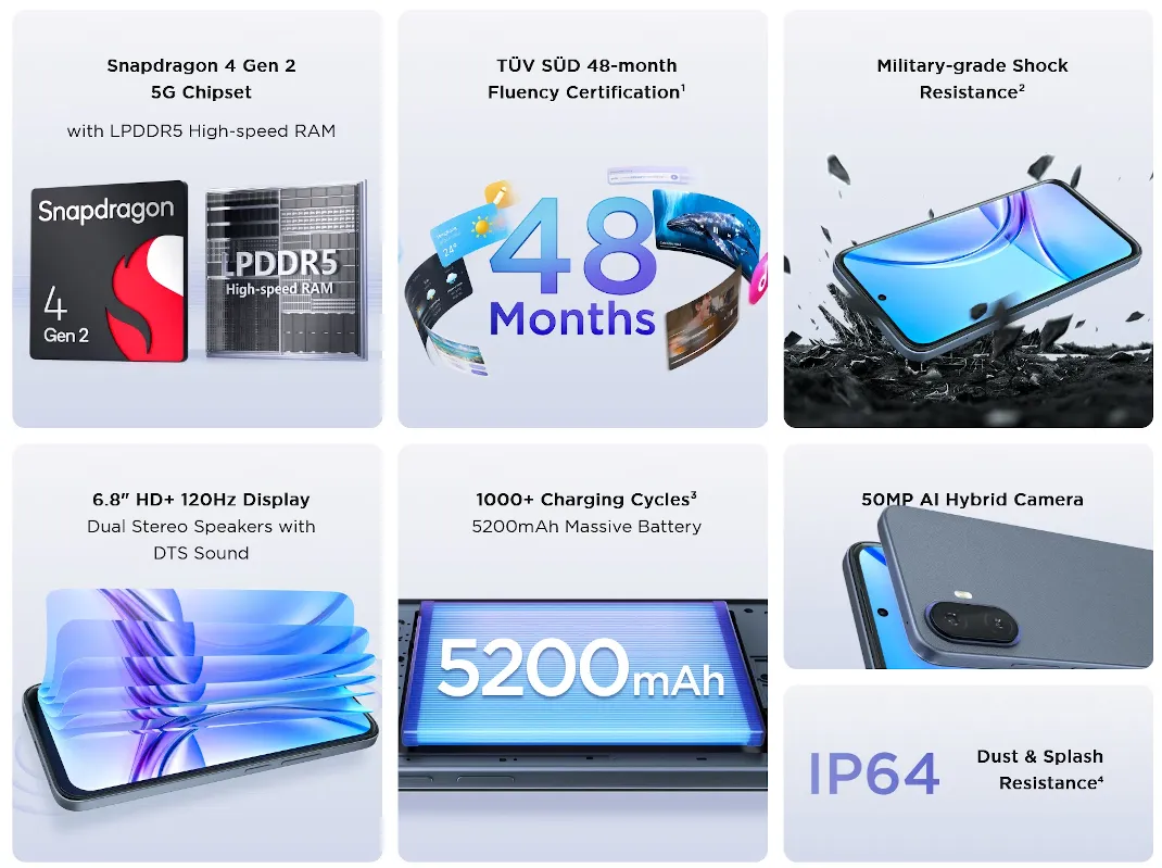 TCL K70 5Gは、6.8インチHD+・120HzディスプレイとSnapdragon 4 Gen 2を搭載したエントリースマホ。5000万画素デュアルカメラや5200mAhバッテリー、防水防塵(IP64)に対応し、海外で発売予定。
