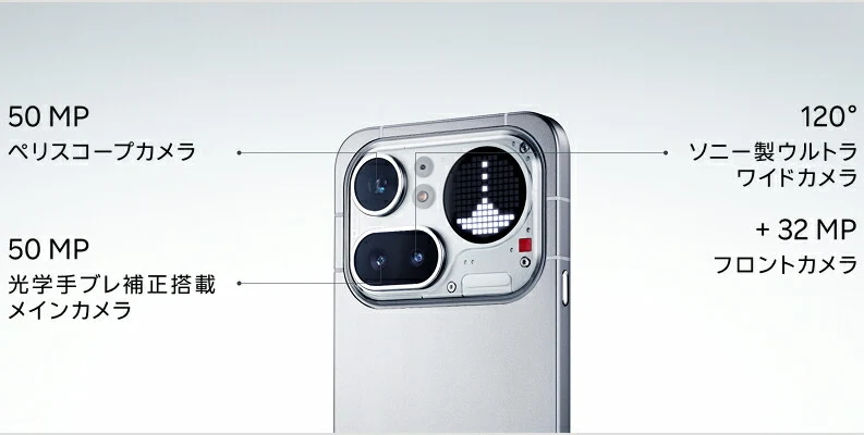 リフレッシュレート144Hzで高解像度な有機ELディスプレイ、背面のGlyphマトリックス、ペリスコープ望遠 3.5倍のカメラ、防水防塵対応(IP65)、50W急速充電対応5080mAhバッテリー、5300mm²の大型ベイパーチャンバーによる冷却システム、ステレオスピーカー、OSはAndroid 16 (Nothing OS 4.1) 、接続端子はUSB Type-C、生体認証は指紋認証(画面内)と顔認証に対応しています。