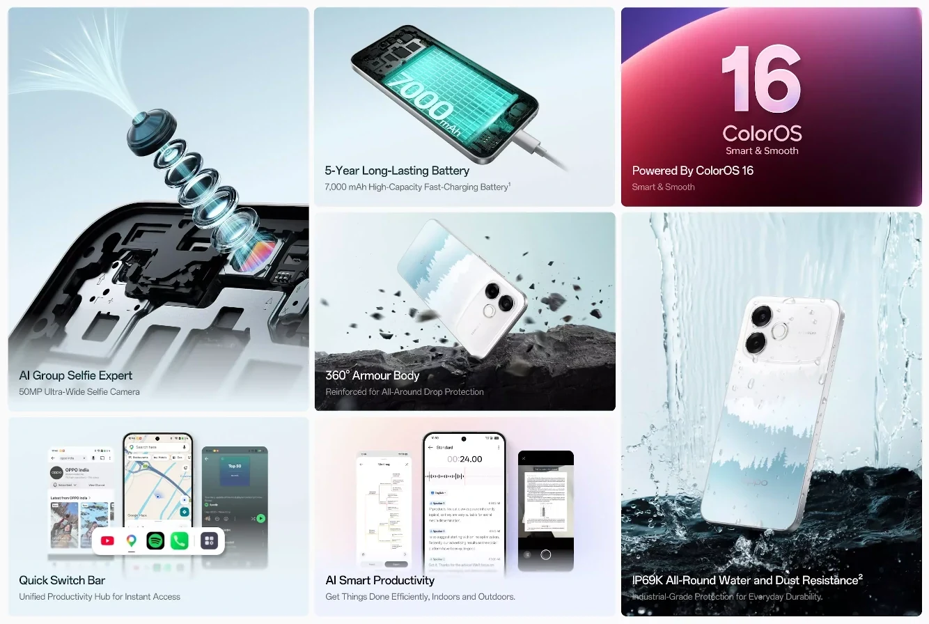 OPPO F33 Pro 5Gは、6.57インチFHD+・120Hz有機ELとDimensity 6360 MAXを搭載したミッドレンジスマホ。7000mAhバッテリーや80W急速充電、防水防塵耐衝撃対応。インドで発売、37,999INR(約6.5万円)。
