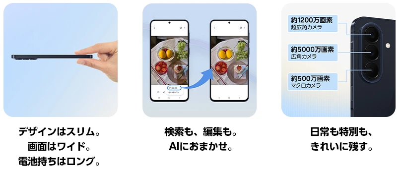 リフレッシュレート120Hzの有機ELディスプレイや光学手振れ補正付3眼カメラ、5G通信対応などが特徴です。最大6世代アップデート予定のOSはAndroid 16 (One UI)、おサイフケータイ(FeliCa/NFC)搭載、防水防塵対応、指紋認証センサーと顔認証に対応、接続端子はUSB Type-Cです。