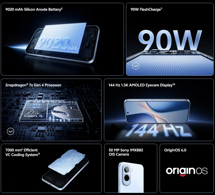 90W急速充電対応9020mAh大容量バッテリー、リフレッシュレート144HzのAMOLEDディスプレイなどが特長です。OSはAndroid 16 (OriginOS 6)、防水防塵対応(IP68/IP69)、画面内に指紋認証センサーを搭載、接続端子はUSB Type-C、イヤホン端子はなしです。