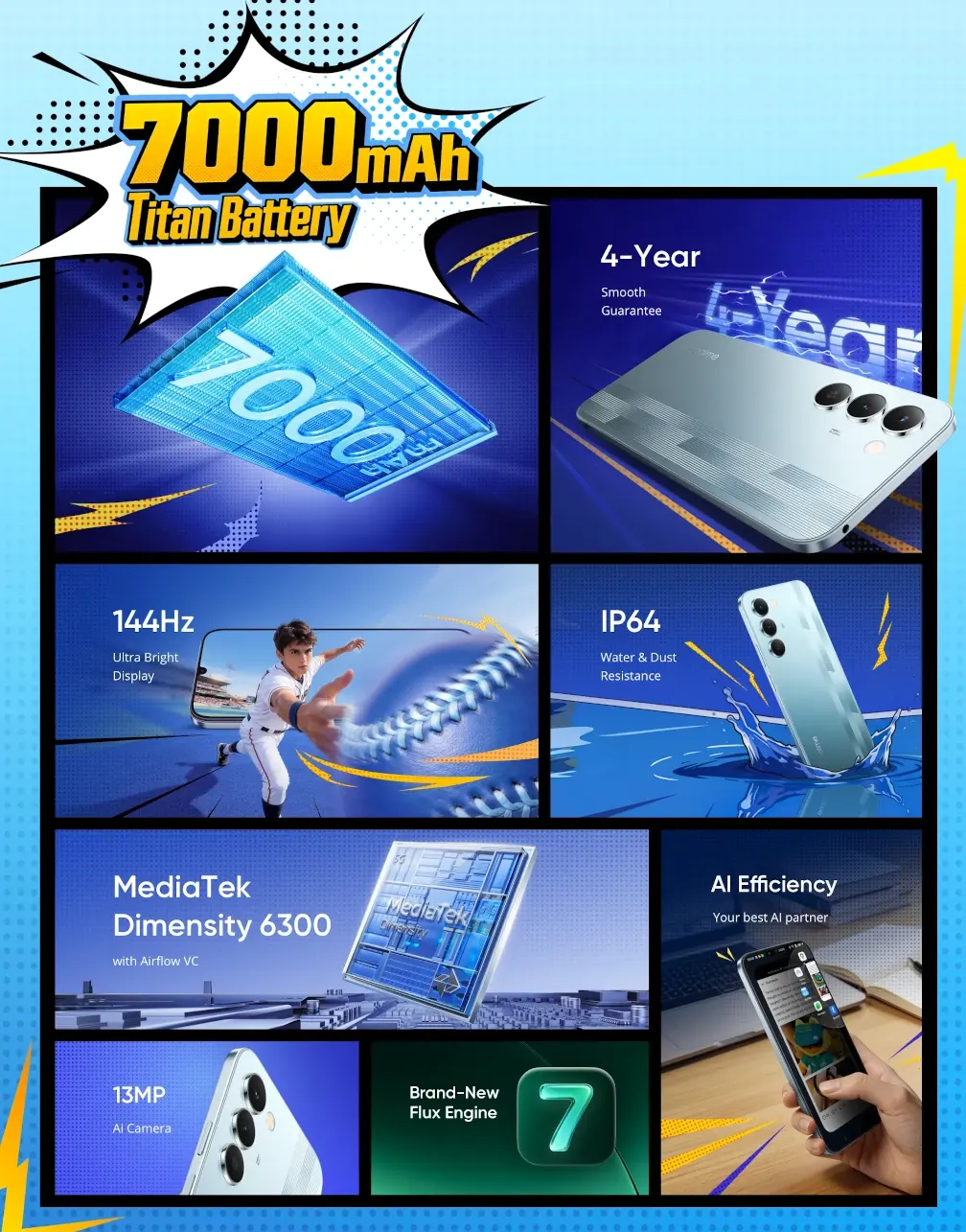 カラーはFlash BlueとNitro Blueの2色。インドで2026年4月に発売、価格はRAM4GB/64GBモデルが13,499INR(約2.4万円)、RAM4GB/128GBモデルが14,499INR(約2.5万円)、RAM6GB/128GBモデルが16,499INR(約2.9万円)となっています。