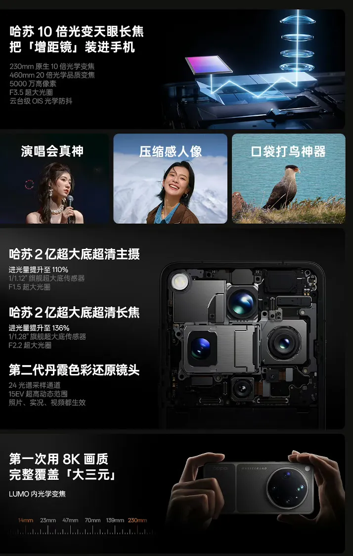 メインカメラ : 20000万画素(メイン 1/1.12インチ 23mm F1.5 OIS)+5000万画素(超広角 1/1.95 14mm F2.0)+20000万画素(ペリスコープ望遠 3x 1/1.28 70mm F2.2 OIS)+5000万画素(ペリスコープ望遠 10x 230mm F3.5)+スペクトル(19mm F2.4)ペンタカメラ Hasselblad