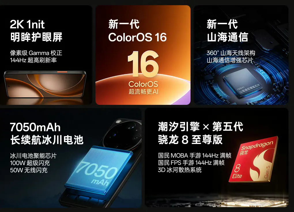高解像度でリフレッシュレート144HzのAMOLEDディスプレイ、OSはAndroid 16(ColorOS 16)、生体認証は指紋認証センサー(画面内)、防水防塵対応(IP68/IP69)、イヤホン端子はなし、接続端子はUSB Type-Cです。オプションで300-1380mmの望遠レンズなども用意されています。