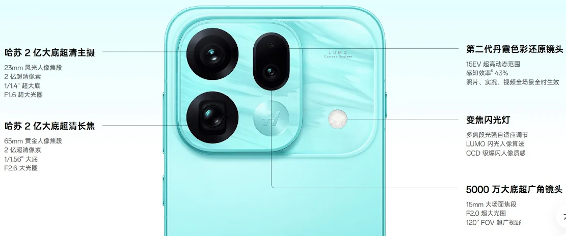 メインカメラ : 20000万画素(メイン 1/1.4 23mm F1.6 OIS)+5000万画素(超広角 15mm F2.0)+20000万画素(望遠 1/1.56 65mm F2.6 OIS)+スペクトル(19mm F2.4)クアッドカメラ