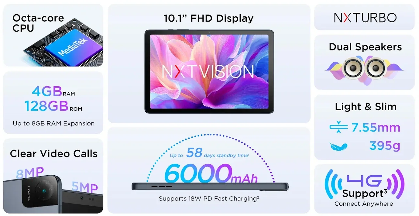 TCL TAB 10 Gen 4 は、10.1インチWUXGA(1920×1080)ディスプレイ、CPUはMediaTek MT8768 2.0GHz オクタコア、RAM4GB、ストレージ容量は128GB、メインカメラは800万画素カメラ搭載のエントリークラスのAndroidタブレットです。