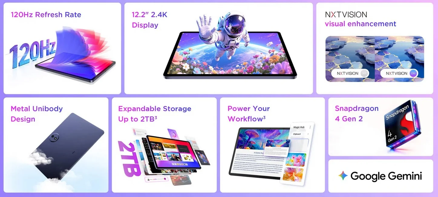 リフレッシュレート120Hzで高解像度ディスプレイや8000mAhバッテリー、T-Pen 2対応、防水防塵対応(IP54)、メタルユニボディデザイン、クアッドスピーカー搭載などが特徴です。OSはAndroid 16、イヤホン端子なし、接続端子はUSB Type-Cです。
