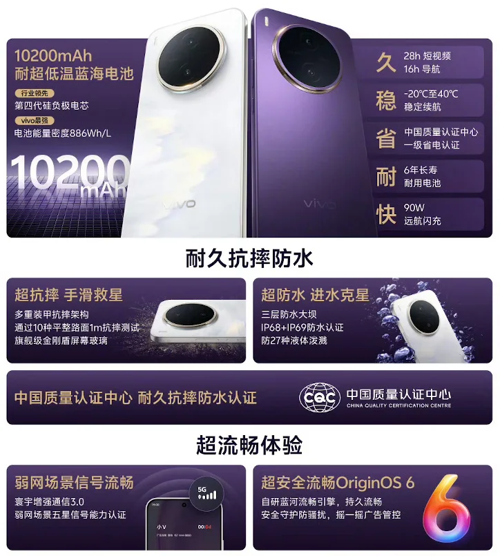 90W急速充電対応10200mAhバッテリー搭載や防水防塵対応(IP68/IP69)、高解像度AMOLEDディスプレイなどが特徴です。OSはAndroid 16 (OriginOS 6)、接続端子はUSB Type-C、生体認証は指紋認証センサー(画面内)と顔認証に対応しています。